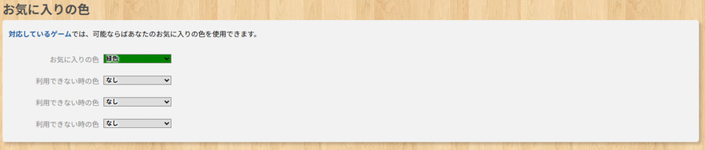 | 利用できない時の色 (3ヵ所) | ゲームの使用上、お気に入りの色が使用できなかった場合に優先される色です。上にある項目ほど優先的に利用されます。 (指定できる色はお気に入りの色と同じ) |