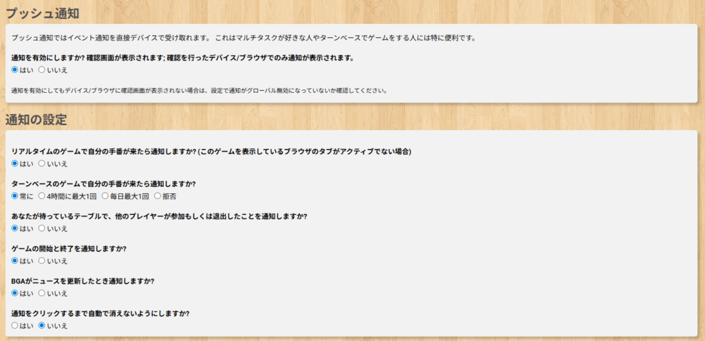 プッシュ通知の設定をONにすることで、手番が回ってきた時や招待された時など、ブラウザやデバイスからの通知を受け取ることができます。