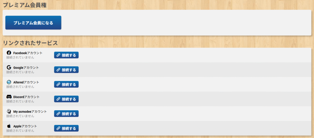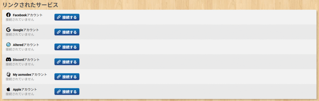 | リンクされたサービス | 外部サービスのアカウントへの紐づけを行うことができます。 【紐づけできる外部サービス】 ・Altered ・Discord ・My asmodee ・Apple ※ログイン時や一部アカウントはゲーム時に使用されます。 |