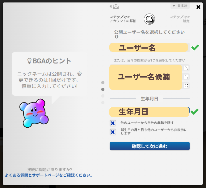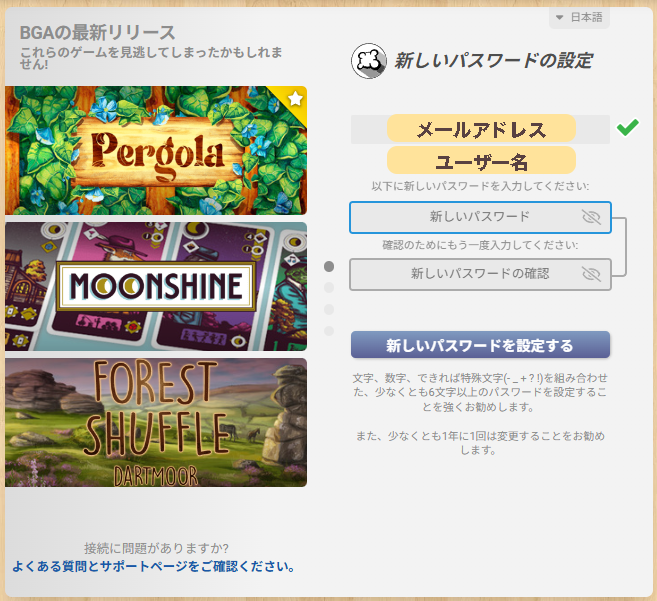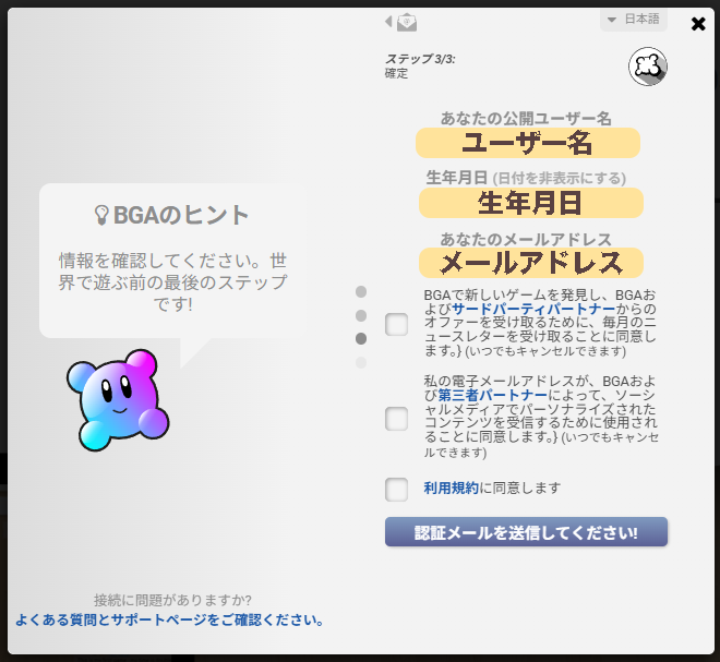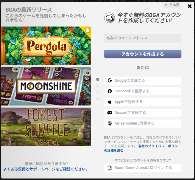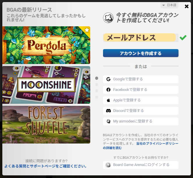 基本的にボードゲームアリーナのページに移動し、記載されている内容を正しく行っていけば、簡単にアカウントを登録することができます。