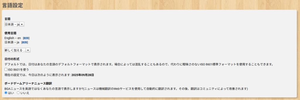 | ボードゲームアリーナニュース翻訳 | ボードゲームアリーナのニュース記事が自動で翻訳されるか設定できます。(デフォルト:はい) 英語の原文のまま読みたい方は『いいえ』を設定してください。 |