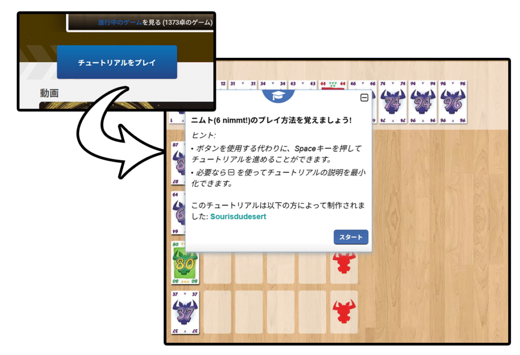 チュートリアルが用意されているボードゲームでは、『チュートリアルをプレイ』ボタンを押すことで、BGAの画面上でゲームの説明を確認できます。