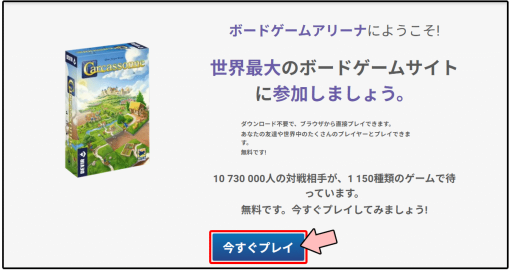 ボードゲームアリーナ(BGA)のページに移動して、『今すぐプレイ』のボタンを押下します。