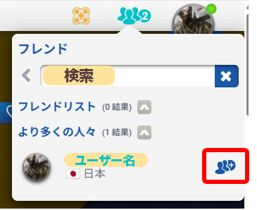 検索欄にユーザー名を入力し、該当ユーザーの右側の申請アイコンを押して、フレンド申請を送ることができます。