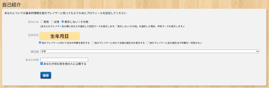 | 生年月日 | 生年月日を設定します。 生年月日(及び年齢)は、以下のいずれかから公開/非公開を設定できます。 ・他のプレイヤーに向けて自分の年齢を表示する ・他のプレイヤーに向けて自身の誕生日を表示する ・他のプレイヤーに私の誕生日や年齢を一切見せない |