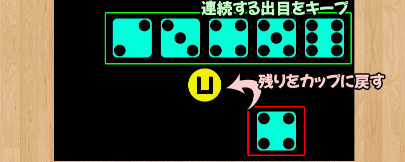 既にキープ中のダイスがある場合は、それに連続する数字を追加する形でキープを行います。
