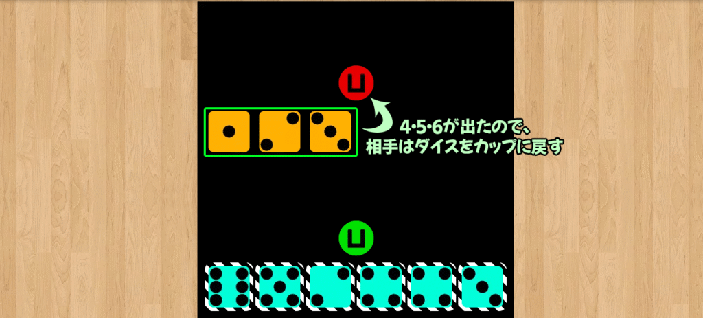 交互にダイスを振りながら、ストレートを目指しつつ、相手に邪魔されないようにキープしてストレートの完成を狙います。