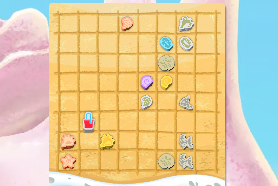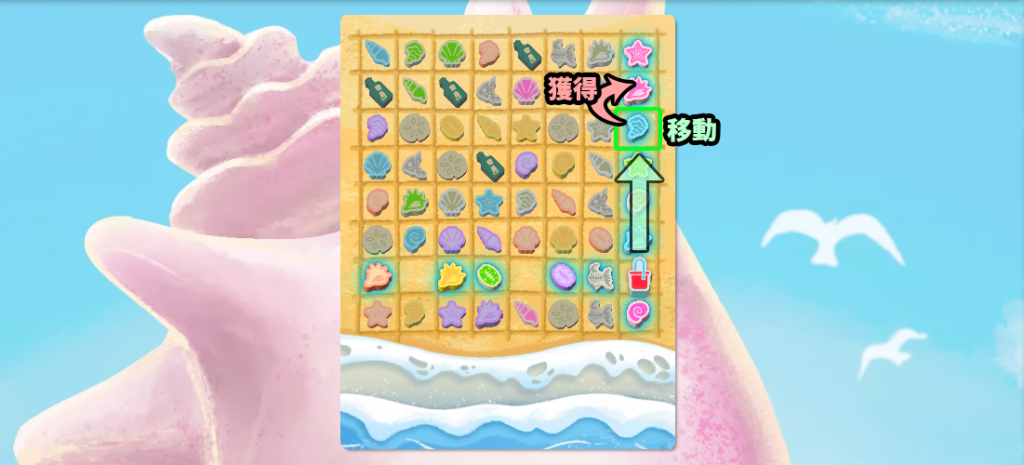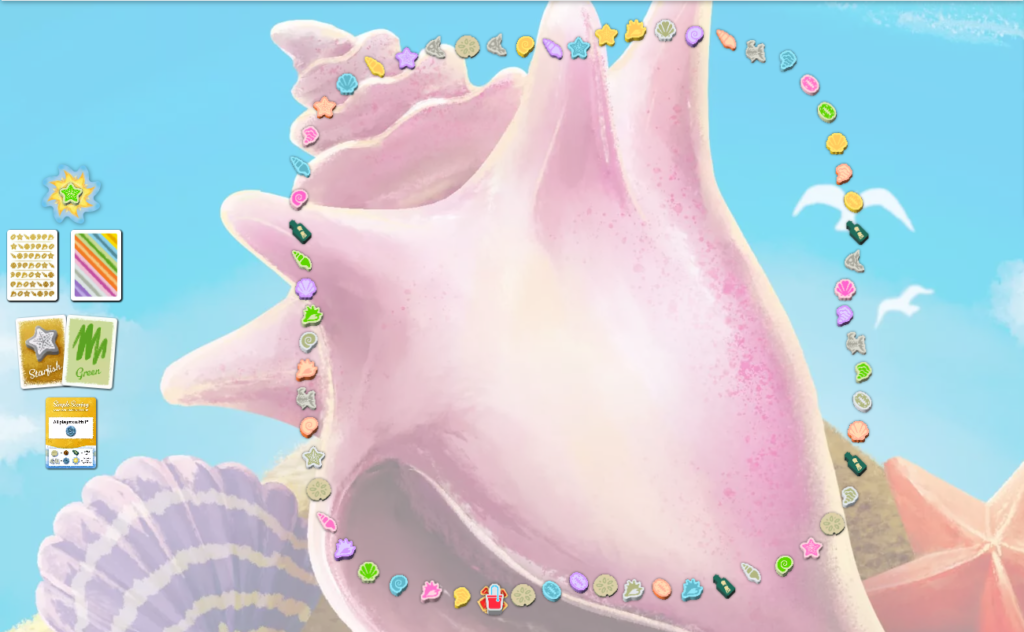 ビーチに並んだ64個のアイテム(貝殻・化石・スカシカシパン・ボトル)を、バケツを動かしながら、1個ずつ取っていきます。各プレイヤーが手元に持つ秘密カードを含めて、同じ形状・色の貝殻を集めることで、コインを獲得できます。