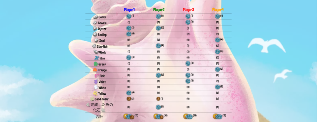 ゲーム終了時に、集めた貝殻の形・色ごとに最も多く集めていればコインを獲得します。
