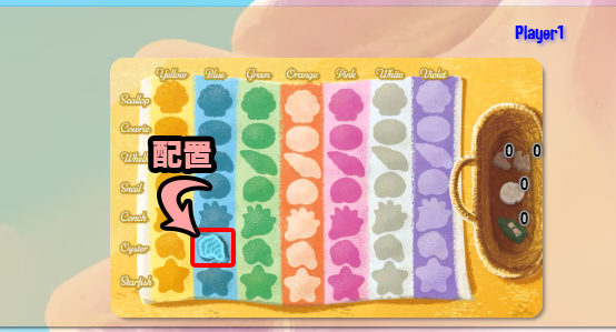 通常と同様にカードを引いて、一致する貝殻を太陽タイルへ移動させます。