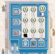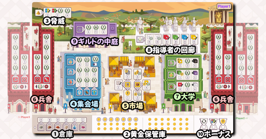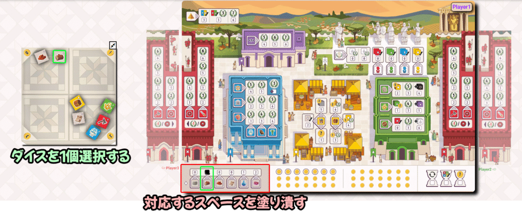 主にダイスを使って各建物のスペースを塗り潰し、効果や勝利点を獲得していきます。