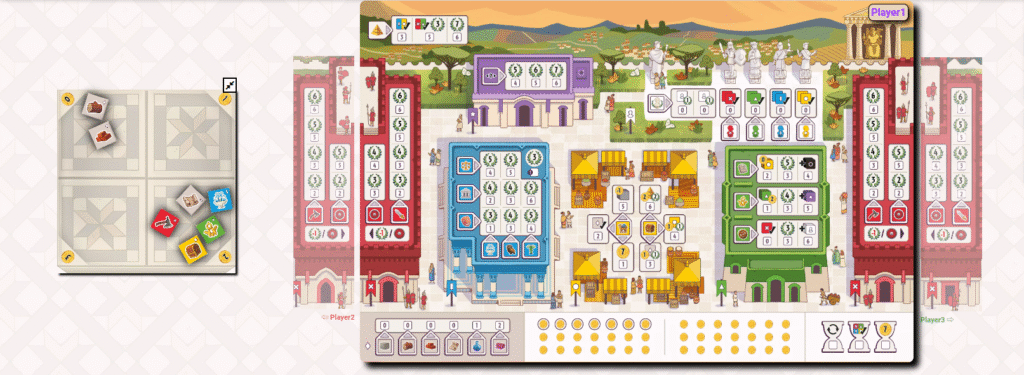プレイヤーは広場で振られるダイスを活用し、建物や驚異を建設しながら、科学・商業・軍事・文化といった分野を発展させていきます。資源の生産やコインの管理、隣国との軍事的な駆け引きなど、都市経営にはさまざまな判断が求められます。