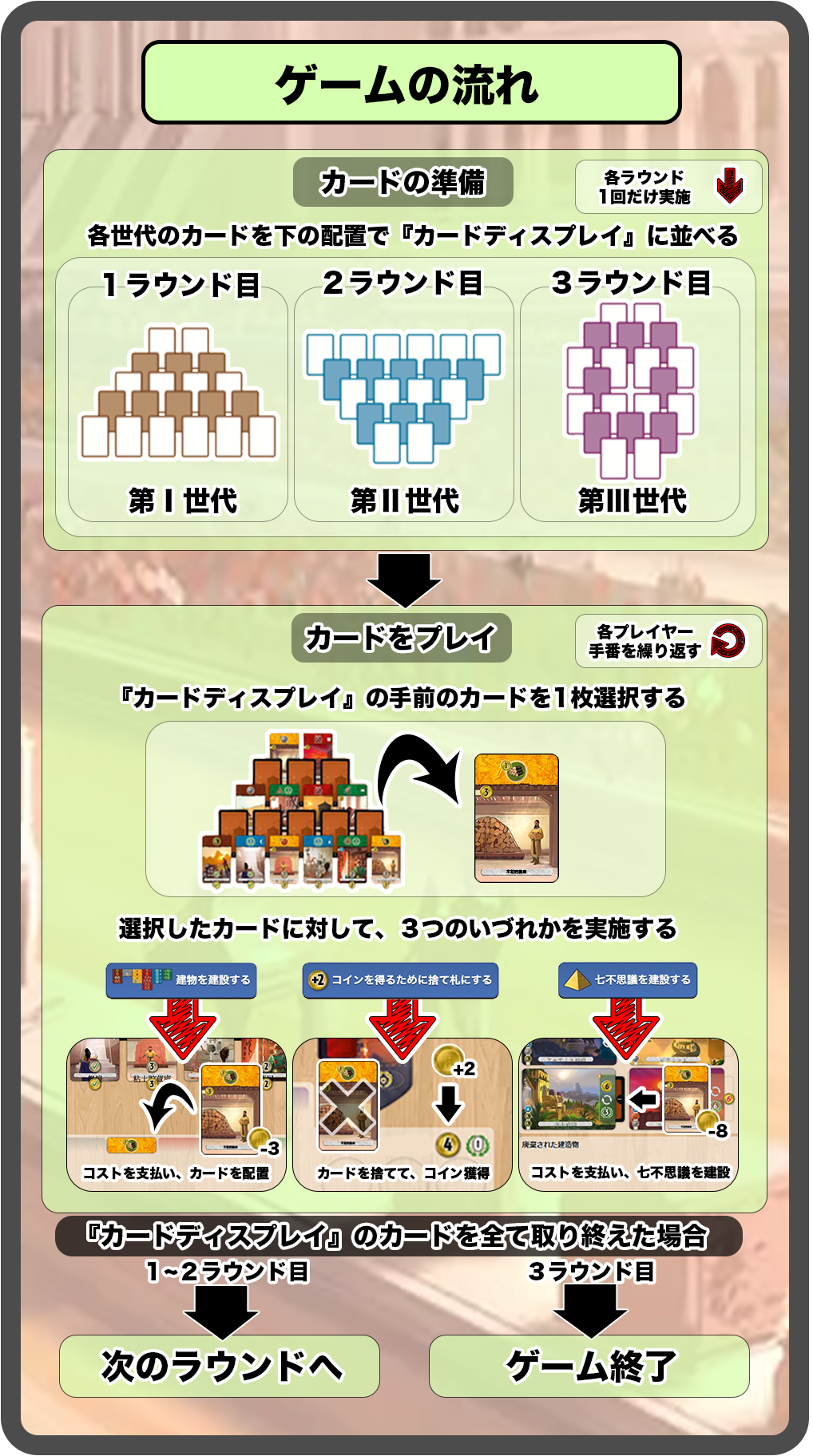 『世界の七不思議:デュエル』で実施するゲームの流れは下記の通りです。