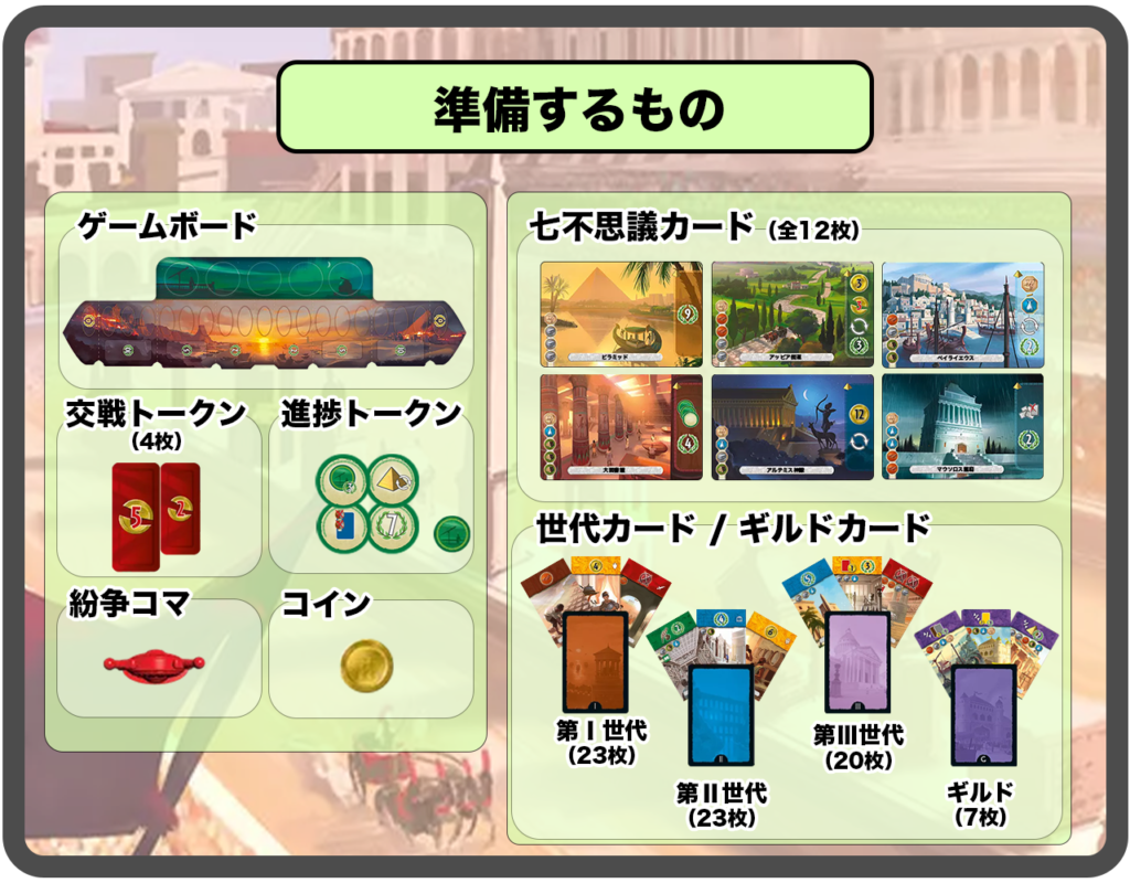 主に『建造物』『七不思議』『進捗トークン』『紛争コマの位置』『コイン』から勝利点を計算していきます。