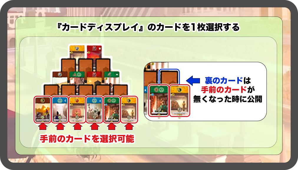 裏側で配置されているカードは、手前のカードが取られた時に公開されます。