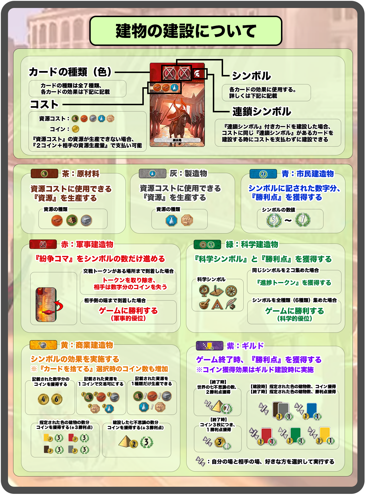 ![]() | 都市計画 | 即座に6コインを獲得する。 また、『連鎖シンボル』を使用して『建造物』建造する度に4コインを獲得することができる。 |