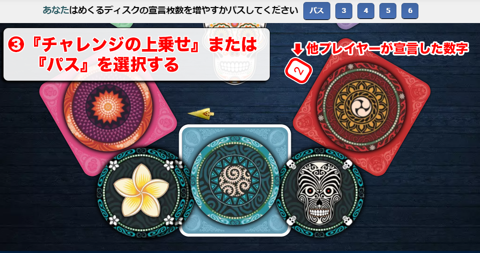 『チャレンジの上乗せ』は、他プレイヤーが宣言した数字よりも『大きい数字』を宣言することが可能です。チャレンジを宣言した人以外全員、『パス』を宣言した時フェーズ❹に移動します。