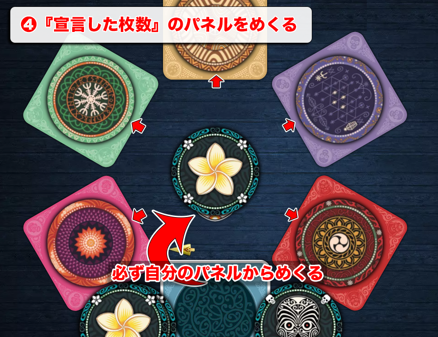 宣言したプレイヤー以外が全員が『パス』を選択した時、宣言した枚数分の『パネル』をめくっていく。(必ず自分の伏せているパネルから順にめくる)