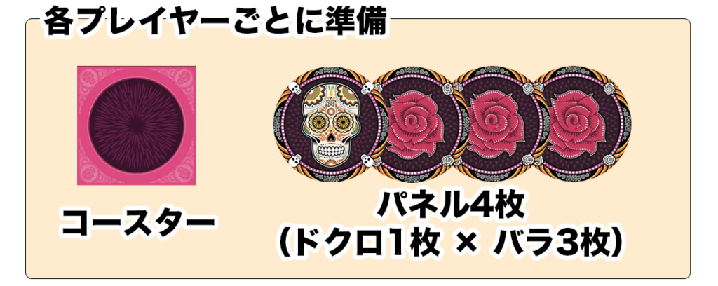各プレイヤーに『コースター』と『パネル4枚』(『ドクロ1枚』と『バラ3枚』)を配り、『コースター』は全体の場にオモテで置き、『パネル』は自分だけ見える手札として準備します。