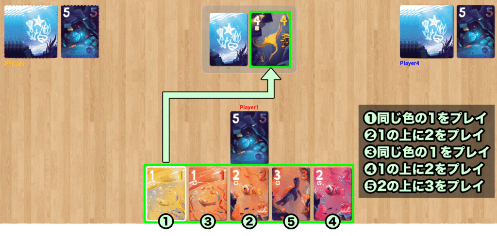 捨て札の一番上のカードより、数値がちょうど+1のカードを色に関係なく出す