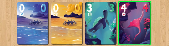 特徴 海の不思議を発見するには、シュノーケリングに勝るものはありません。できるだけ長く水中に滞在して、サンゴやウミガメの間を泳ぎましょう。 スノーケリングは、プレイヤーが他のプレイヤーにカードを出して最も多くの勝利点を獲得することを目指すカード捨てゲームです。 自分の番になったら、中央の山札の一番上のカードよりちょうど1つ値が高いカードを出すことができます。あるいは、値に関係なく、中央の山札の一番上のカードの色と同じカードを1枚以上出すこともできます。 中央の山札にカードを出した後、自分のカードの値が他のプレイヤーの山札の一番上のカードの値よりちょうど1小さい場合は、そのプレイヤーの個人の山札にちょうど1枚カードを出すことができます。このステップでは色は関係ありません。 ラウンドは、任意のプレイヤーが自分の個人の山札に値0のカードを手に入れた時点で即座に終了します。その時点で、各プレイヤーは自分の山札の一番上のカードの点数と同じ得点を獲得し、その点数は前の合計に加算されます。最初に6点に到達またはそれ以上を獲得したプレイヤーがゲームに勝利します。同点の場合は、次のラウンドが行われます。