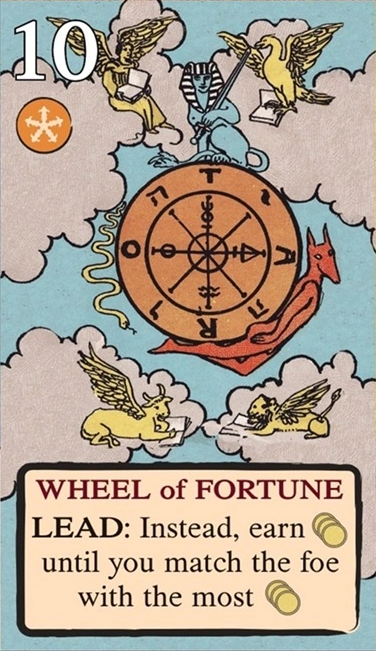 このスートをリードするとき、他の3スートの最上段カード(レベル2以上)を捨てることができ、最終的に運命トークンを1個獲得(捨てたスートで相手が最高レベルになるとトークンを奪われる)
