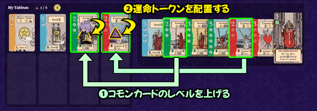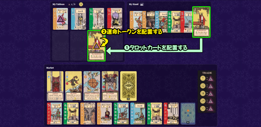 運命トークンを持つプレイヤーよりも高いレベルのタロットカードを同じスートに配置にした場合、相手から運命トークンを奪うことができます。