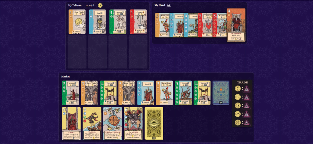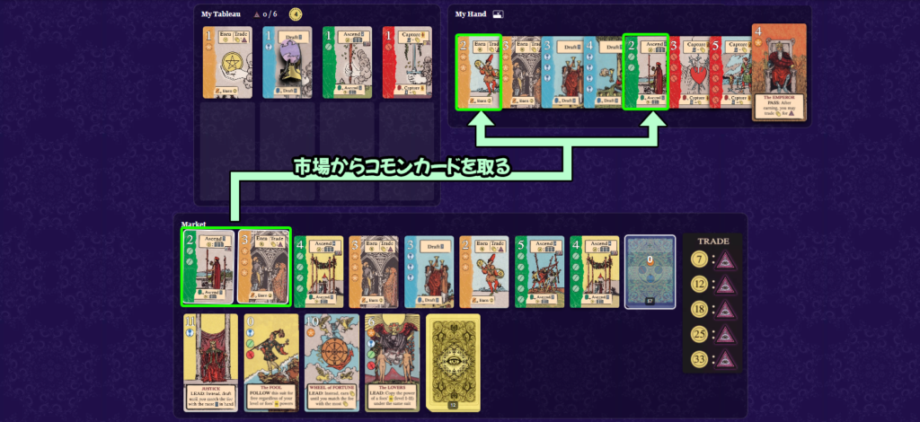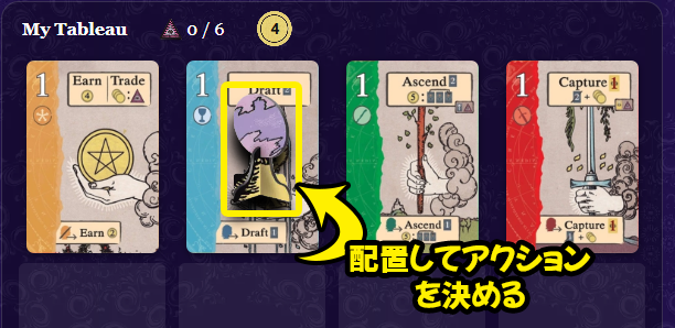 手札または場にあるコストを支払ってタロットカードを獲得し、自分のタブローのスートの下に配置します。