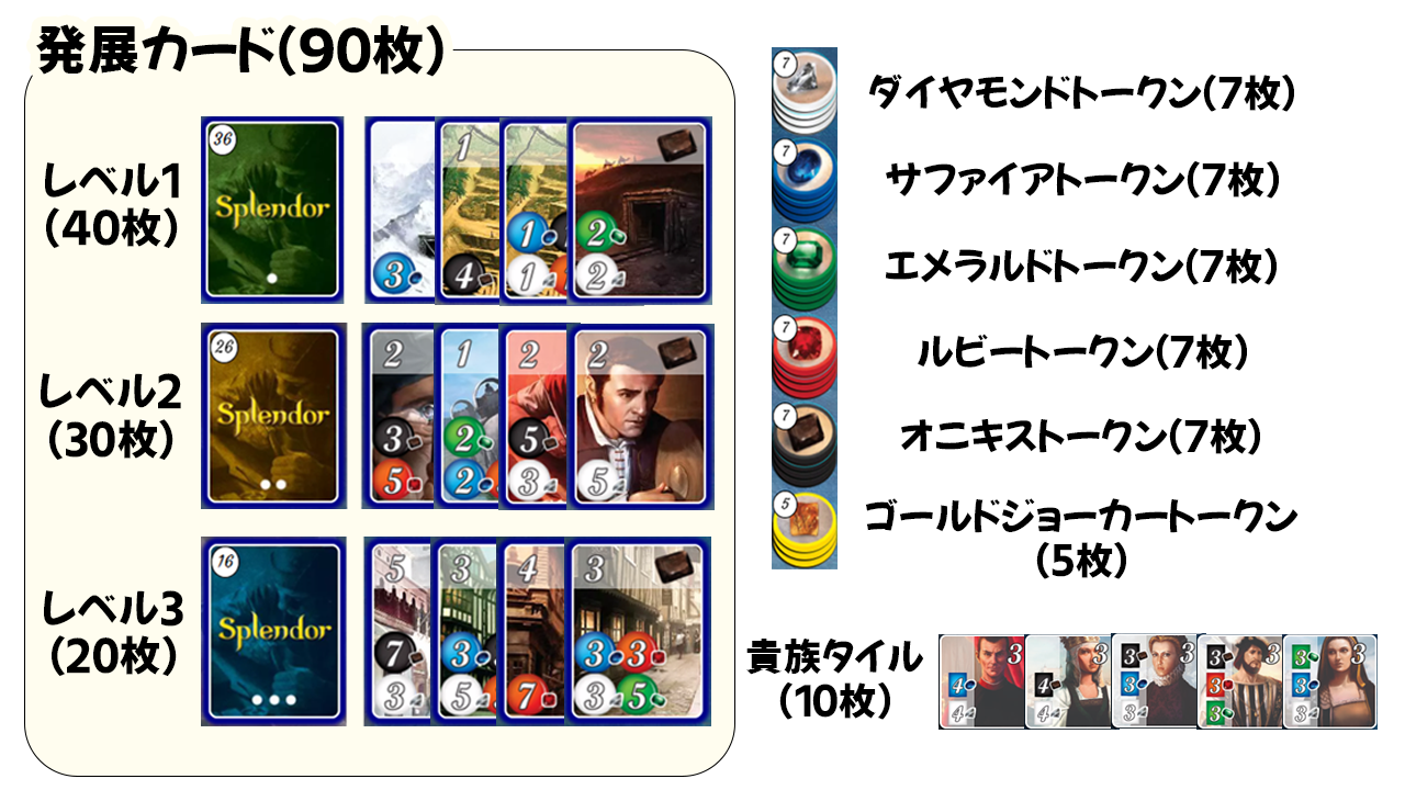 全体の場に『発展カード』『貴族カード』『宝石トークン』を用意していきます。