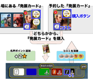 『発展カード』を購入した時に『貴族タイル』の獲得条件が満たした場合は『貴族タイル』を獲得でき、名声ポイントを獲得することができます!