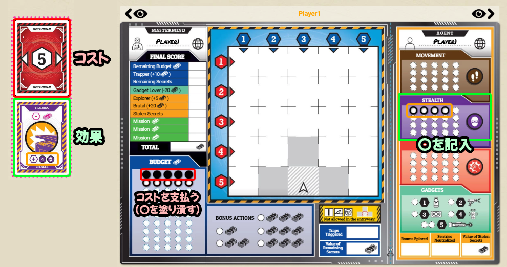 選択したセットの山札の一番上のカードに書かれている「数字」分だけ資金を支払います。(資金欄の〇を塗りつぶします)