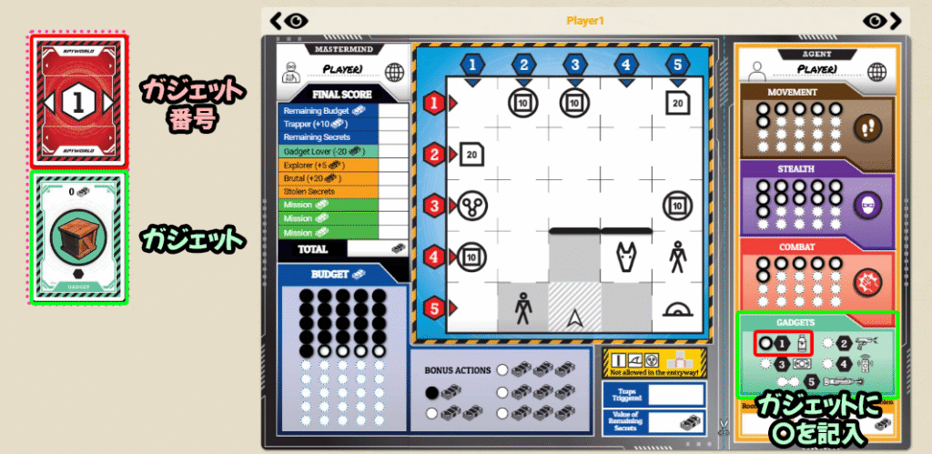| ※資金を得た場合、自分の資金欄に〇を記入します。 ※壁で完全封鎖された秘密はどちらの得点になりません。 | |||