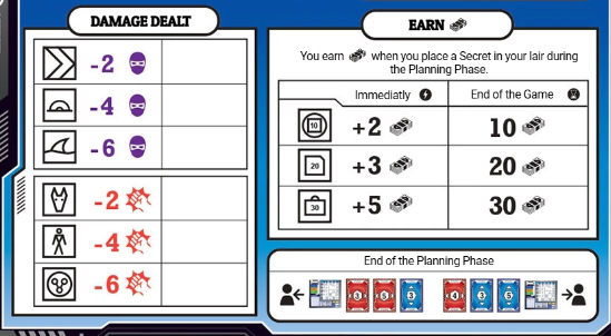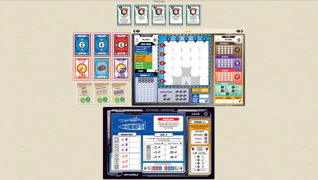 ![]() | ![]() | ![]() | 秘密 秘密を記入した際、資金を獲得します。秘密は相手に取られると相手の得点となりますが、取られなかった場合は自分の得点になります。 ・フィルム:資金+2、得点:10 ・フロッピー:資金+3、得点:20 ・マクガフィン:資金+5、得点:30 |