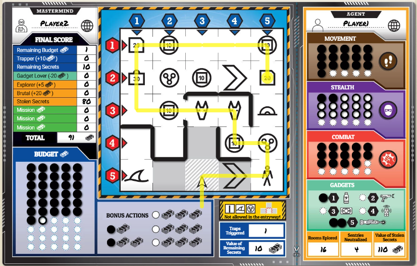ゲーム前半の計画フェーズでは、アジトに罠や監視員を配置して防衛を固めたり、エージェントを訓練して潜入能力を高めたりします。後半の探索フェーズでは、隣から渡されたアジトへ侵入し、壁を避け、罠や番兵を突破しながら秘密を奪います。