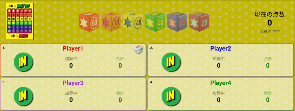 ゲームの目的は、ダイスを振って得点を積み重ね、誰よりも早く目標点数に到達することです。