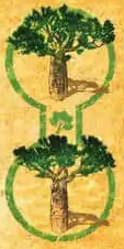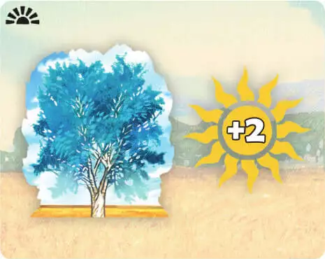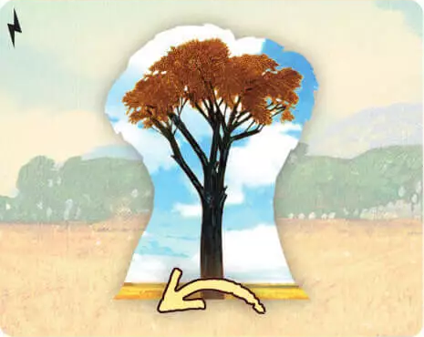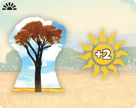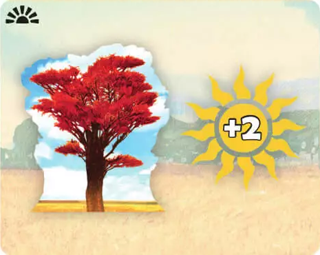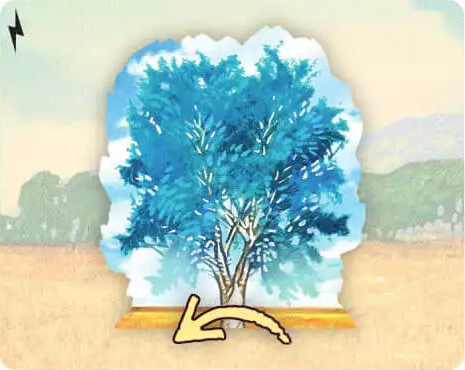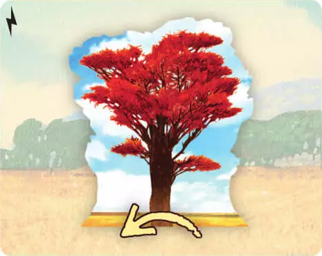 ![]() | ツリーマス 4色(コガモ・茶・緑・赤)あり、それぞれ2マスがつながっています。 両方のマスにゾウが置かれたときに『ツリー完成』となり、ツリースタンドを横に倒してエネルギーを+1します(緑のツリーのみ +2)。 すでに横になっているツリーを完成させても効果は得られません。 |