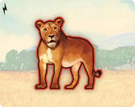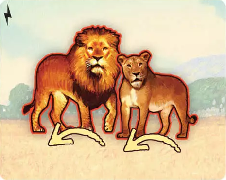 | ❺ | ライオンの配置 旅タイルに従い、メスライオンとオスライオンを指定のサバンナボードに横向き(寝た状態)で置きます。 |