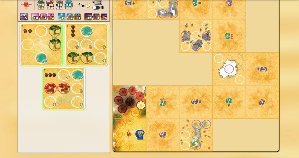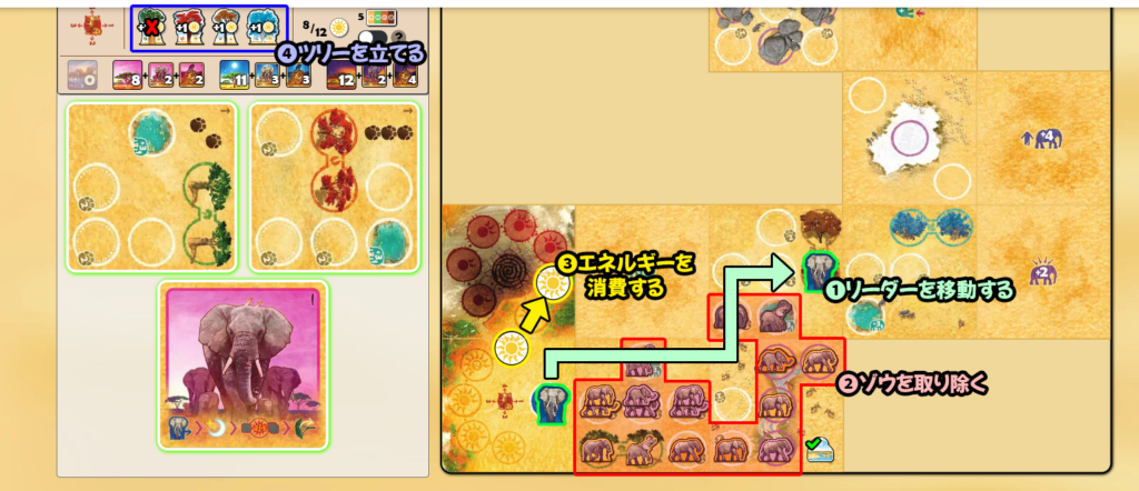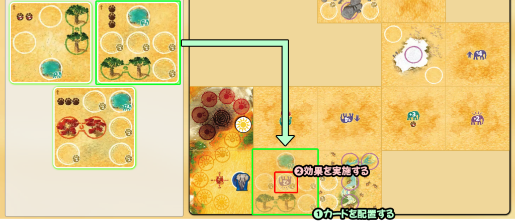 手札からサバンナカードを1枚選び、カード左上に描かれた足跡の形と同じ形にゾウ駒を配置します。使用したカードは捨て札になります。