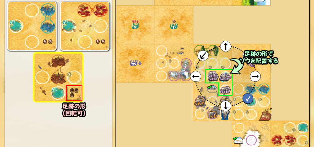 | ・ | 足跡の形をすべて満たす 足跡の形のゾウを同じ手番にすべて配置する必要があります。 条件を満たせない場合は、そのカードでこのアクションは実施できません。 |