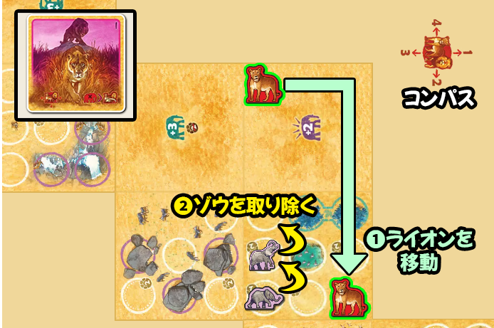 | ・起きているライオンの場合 最も近いゾウのいるエリアに近づくようにエリアを移動します。 ルートが複数ある場合は『ライオンコンパス』(スタートボード記載)の番号が小さいルートを優先します。 既にゾウのいるエリアにいる場合は移動しません。 | |