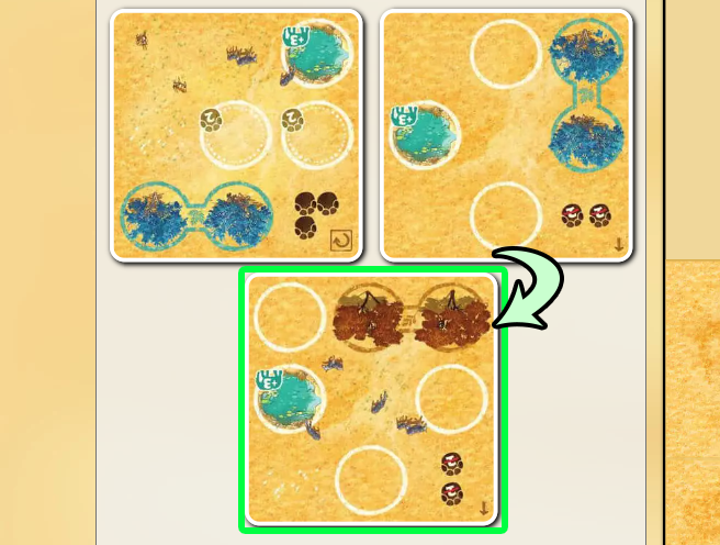![]() | 荒地マス このマスへの配置にはゾウ駒を2個消費します。 特定のカードを使う場合はこのペナルティを無視できます。 |