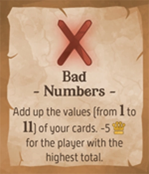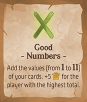 カードの値(1から11まで)を合計する。合計が最も高いプレーヤーに勝利点-5