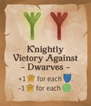 「ナイトの5」を持っているプレイヤーは、クエストタイルを1枚引き、記載されている2つ(両面)の得点条件のうち1つを選択します。
