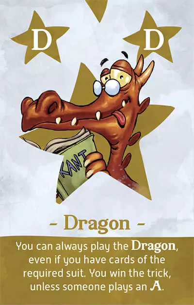 必要なスートのカードを持っていても、常にドラゴンを出すことができます。Aが出されない限り、あなたがそのトリックに勝ちます。リードされたスートのAが出された場合、そのAがトリックに勝ちます。出されなかった場合、そのトリックで最後に出されたAが勝ちます。ドラゴンでトリックをリードする場合、リードされたスートは次に出されるカードのスートになります。