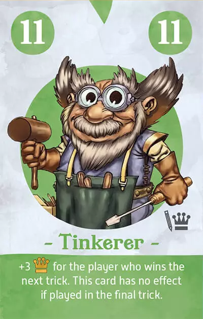 特徴 ドワーフの王様(Le Roi des Nains)は53枚のカードの山札でプレイされるトリックテイキングゲームです。各13枚のカードからなる3つのスート(ドワーフ、ゴブリン、騎士)と14枚の特別カードです。このゲームには20枚の契約タイルも含まれています。 ゲームは7ラウンドにわたって行われます。ラウンドの開始時に、ディーラーは特別なカードをランダムに1枚引き、それをすべてのプレイヤーに読み上げて山札にシャッフルし、その後その山札をすべてのプレイヤーに均等に配ります。(最初のラウンドのディーラーはゲームのオーナーです。その後のラウンドのディーラーは、前のラウンドでドワーフの5を獲得した人です。)騎士の5を受け取ったプレイヤーは、契約タイルを引き、それを読み、そのラウンドに適用する2つの得点ルールの1つを選択します。 ゴブリンの5を持っているプレイヤーが最初のトリックでリードします。プレイヤーは可能であればそれに従う必要があり、ゲームには切り札は含まれません。リードされたスートでプレイされた最も高いカードがトリックを獲得し、次のトリックにつながります。すべてのカードがプレイされたら、プレイヤーはポイントを計算し(マイナスの場合もあります)、特別なカードと契約タイルをゲームから取り除き、次のラウンドに向けてシャッフルします。 7ラウンドで最も多くのポイントを獲得したプレイヤーがゲームに勝利します。