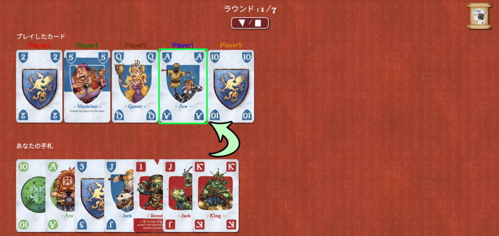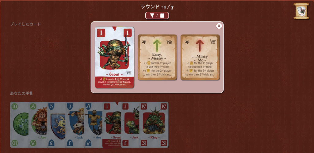 トリック数を事前に宣言したりする必要はなく、そのラウンドのクエストに合わせてプレイ方針を考えるのが特徴です。