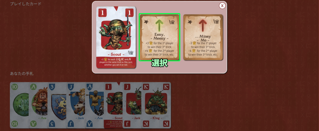 最終トリック中にこのカードをプレイすると、勝敗に関わらず勝利点+3