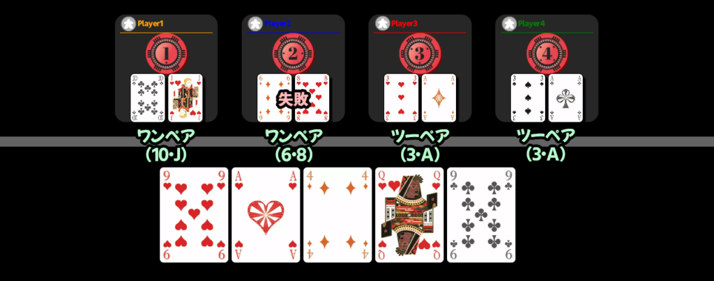 手札を公開していき、役の強さの順番が全員当たっていた場合、