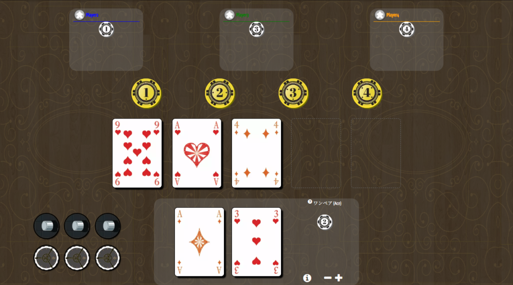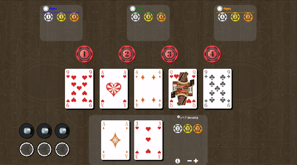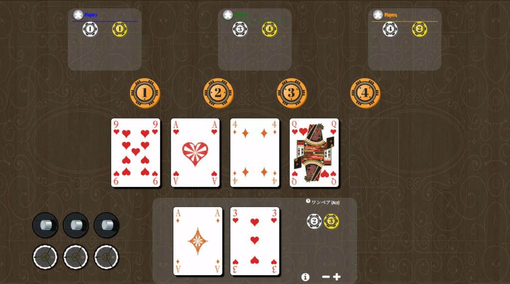 誰がどのチップを狙うかを見ながら、仲間の手の強さを読んでいきましょう。