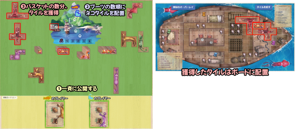 ❸全員がパスかネコタイルがなくなるまで、❷の順番でバスケットを支払ってネコタイルを獲得して船に配置する。